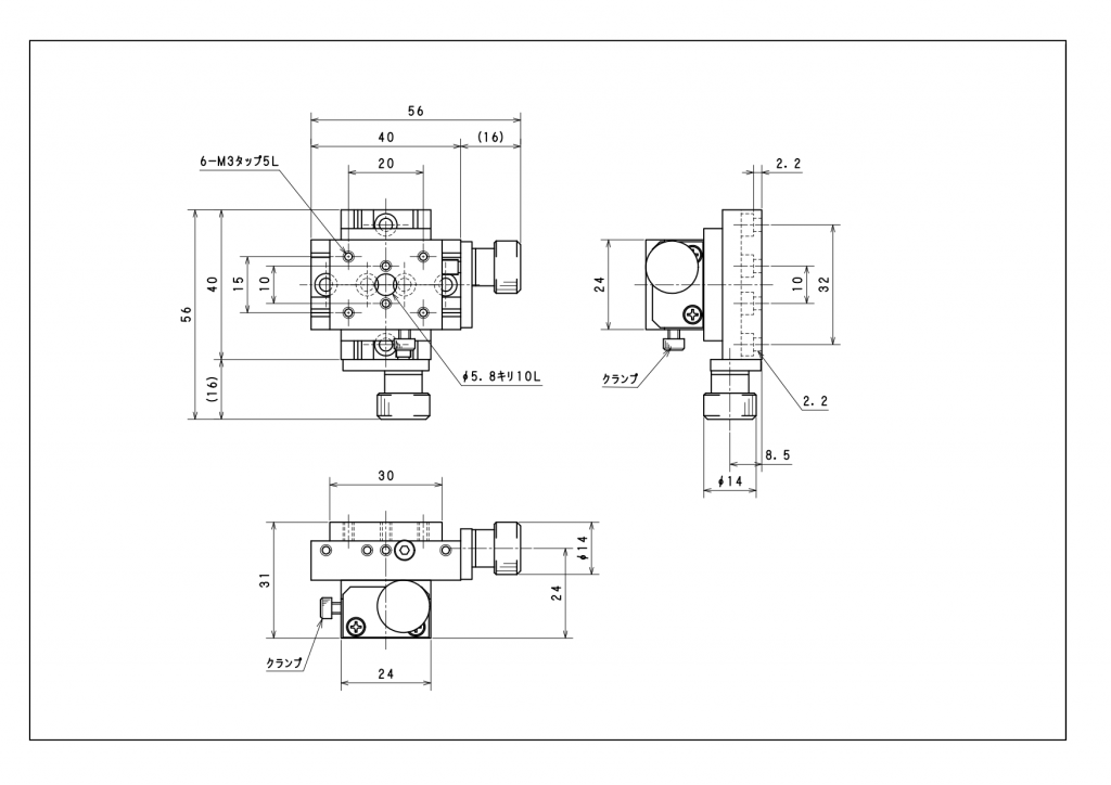 ・取付穴(上面):4-M3 10×20位置、2-M3 ピッチ10 中央、φ5.8キリ 中央