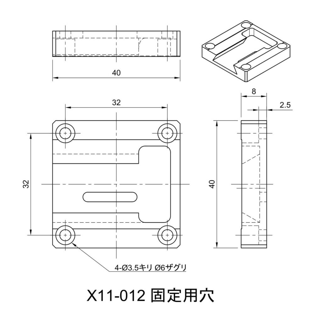 ・固定穴(底面):4-φ3.5キリ φ6ザグリ 深5.5 □32位置(M3キャップボルト用)