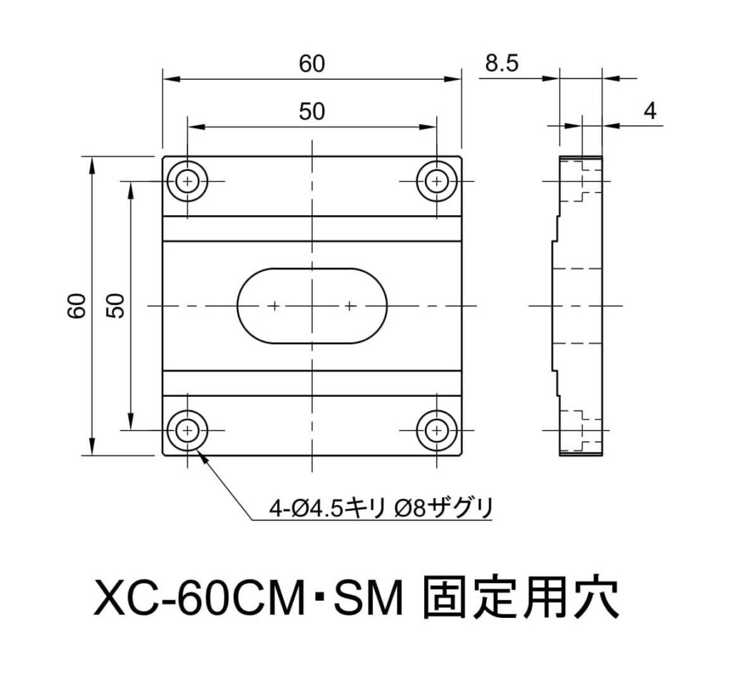 ・固定穴(底面) :4-φ4.5キリ φ8ザグリ 深4.5 □50位置(M4キャップボルト用)