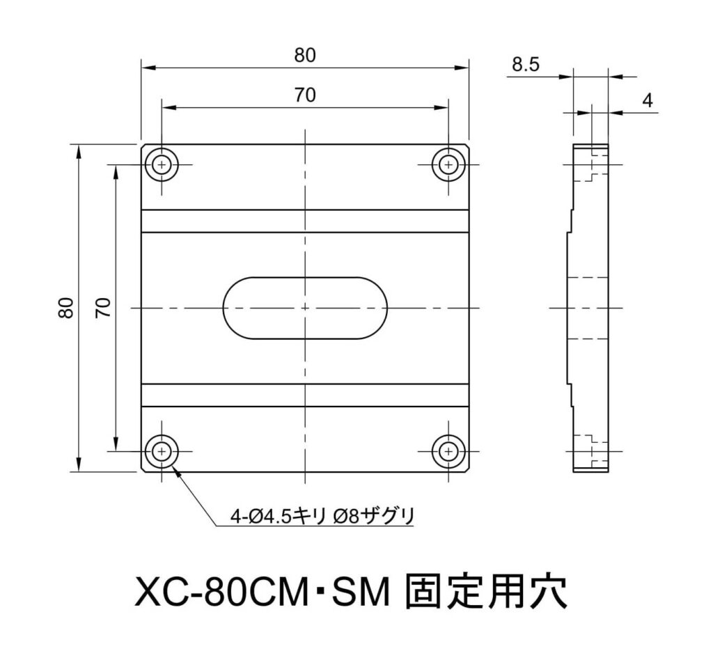 ・固定穴(底面) :4-φ4.5キリ φ8ザグリ 深4.5 □70位置(M4キャップボルト用)